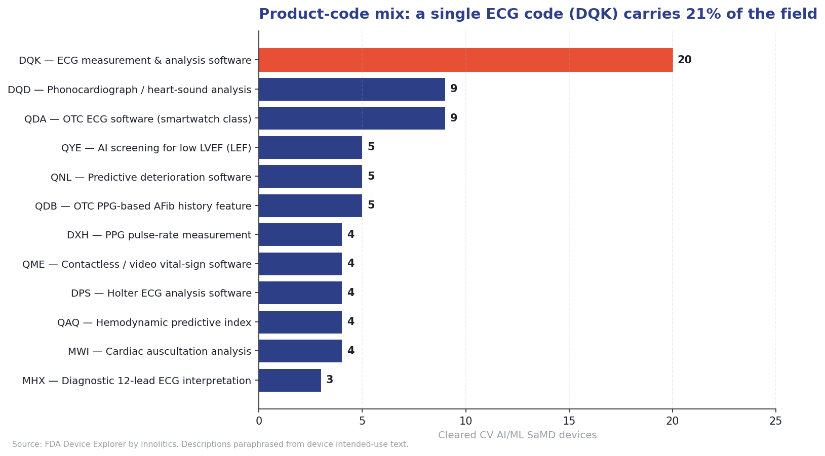 Product-code distribution reflects the archetype mix. A single ECG code, DQK (electrocardiograph measurement and analysis software), accounts for 20 of the 97 devices (21%) [1]. That is high concentration: in radiology AI, no single code carries more than about 12%. The implication is practical, if you can find a credible DQK predicate, your clearance path is much shorter than a De Novo into a new code.