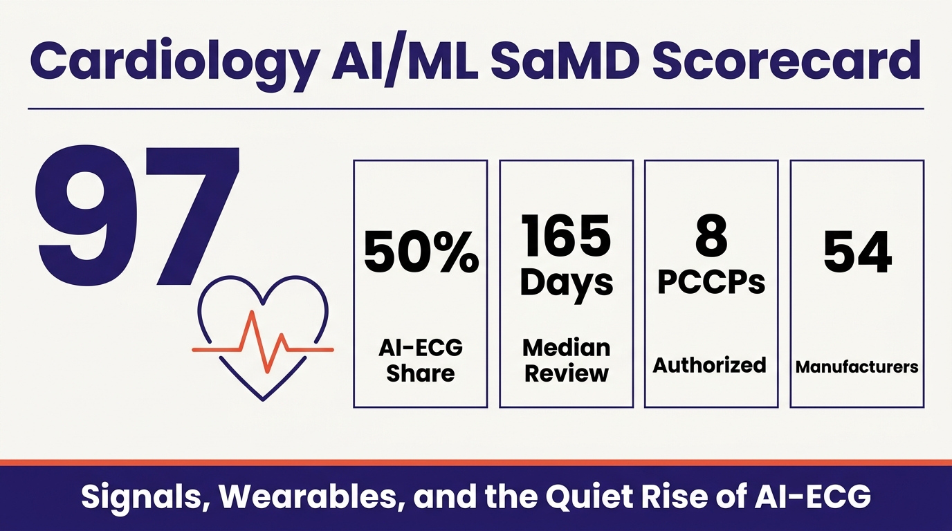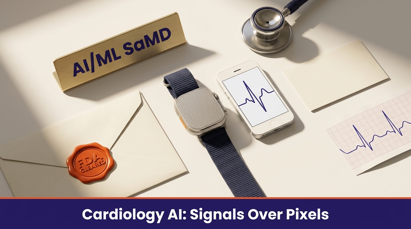 That change is happening in cardiology. Cardiovascular AI/ML SaMD is the second-largest specialty after radiology, with 97 cleared devices between 2006 and Q1 2026, per FDA Device Explorer data filtered to the Cardiovascular review panel, AI/ML usage, and SaMD classification [1]. Structurally it looks nothing like radiology. It is a market for signals, not pixels: twelve-lead ECGs, single-lead patches, wrist PPG, chest phonocardiograms, and continuous arterial-pressure waveforms in the OR. It is also where FDA's Predetermined Change Control Plan (PCCP) framework is being adopted most aggressively, where consumer-electronics companies have built durable regulated-device businesses, and where AI is being used not just to help interpret an existing test but to create a new screening tier in front of the cardiologist.