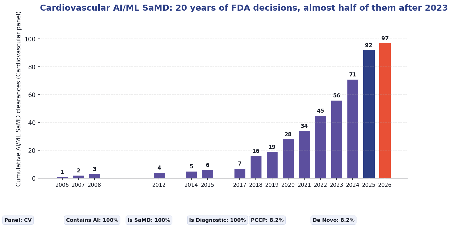 [1] FDA Device Explorer by Innolitics. Cardiovascular AI/ML SaMD Clearances, 2006β2026 YTD. Data accessed April 2026. https://fda.innolitics.com/