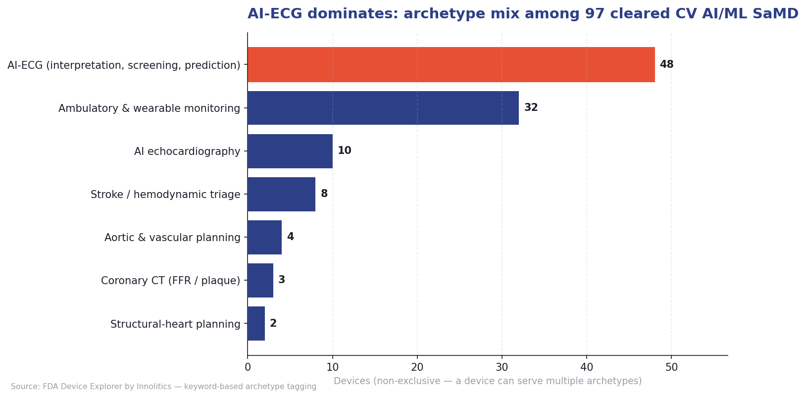 We then tagged every record using substring matches on cleared device name and intended-use text. Keywords like "ECG", "PPG", "echocardiograph", "Holter", "FFR", "plaque", and "amyloidosis" mapped each device to one or more of seven archetypes. Because a single device can satisfy multiple archetypes (e.g., a wearable PPG device that also detects atrial fibrillation), archetype counts sum to more than 97. Archetype shares are reported as a fraction of the 97 distinct devices.