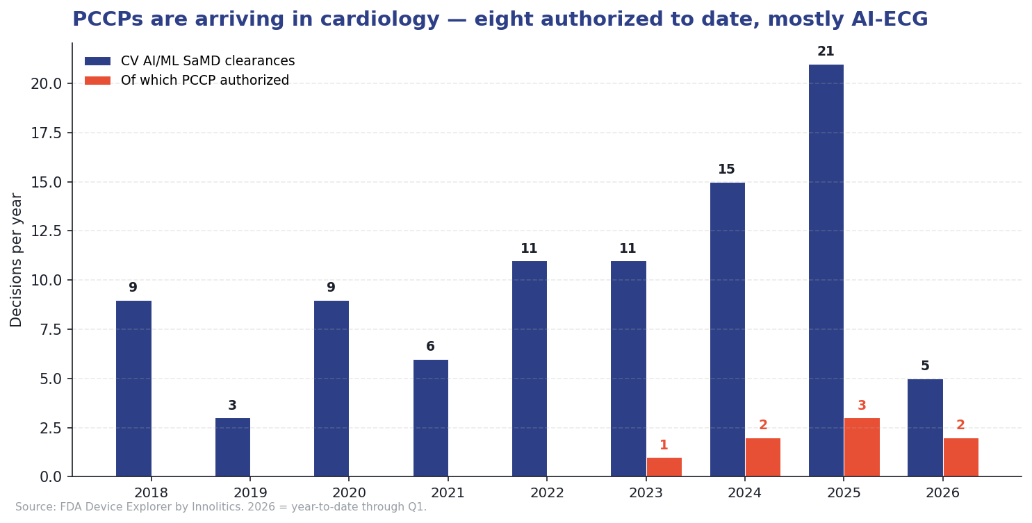 Eight of the 97 cleared devices include an authorized PCCP, 8.2% of the cohort, but all eight have been authorized in the last 30 months [1]. The first appeared in September 2023 (Anumana's Low Ejection Fraction AI-ECG Algorithm, K232699). By Q1 2026, two of the most recent five clearances include a PCCP, and the trailing-twelve-month rate is roughly one in five.