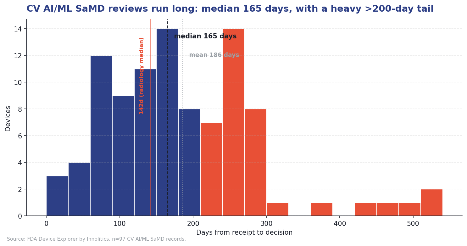 Median review time across the 97 devices is 165 days; the mean is 186 days [1]. The fastest was 23 days; the slowest 536. Forty of the 97 (41%) took more than 200 days. The 2025 year-in-review reported a radiology AI median of about 142 days, so cardiology AI takes roughly 16% longer on average [2].