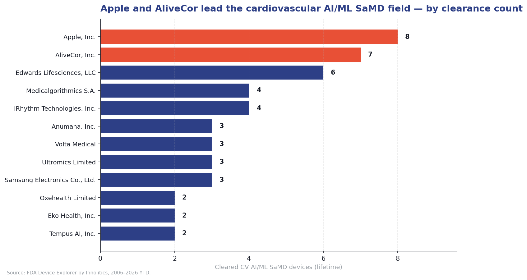 Apple leads with eight clearances, followed by AliveCor (seven), Edwards Lifesciences (six), and Medicalgorithmics and iRhythm tied at four [1]. Anumana, Volta Medical, Ultromics, and Samsung are tied at three. Two consumer-electronics companies in the top group (Apple and Samsung) is unusual: no consumer-electronics company is anywhere near the top of the radiology AI leaderboard. In cardiology they are setting the regulatory pace.