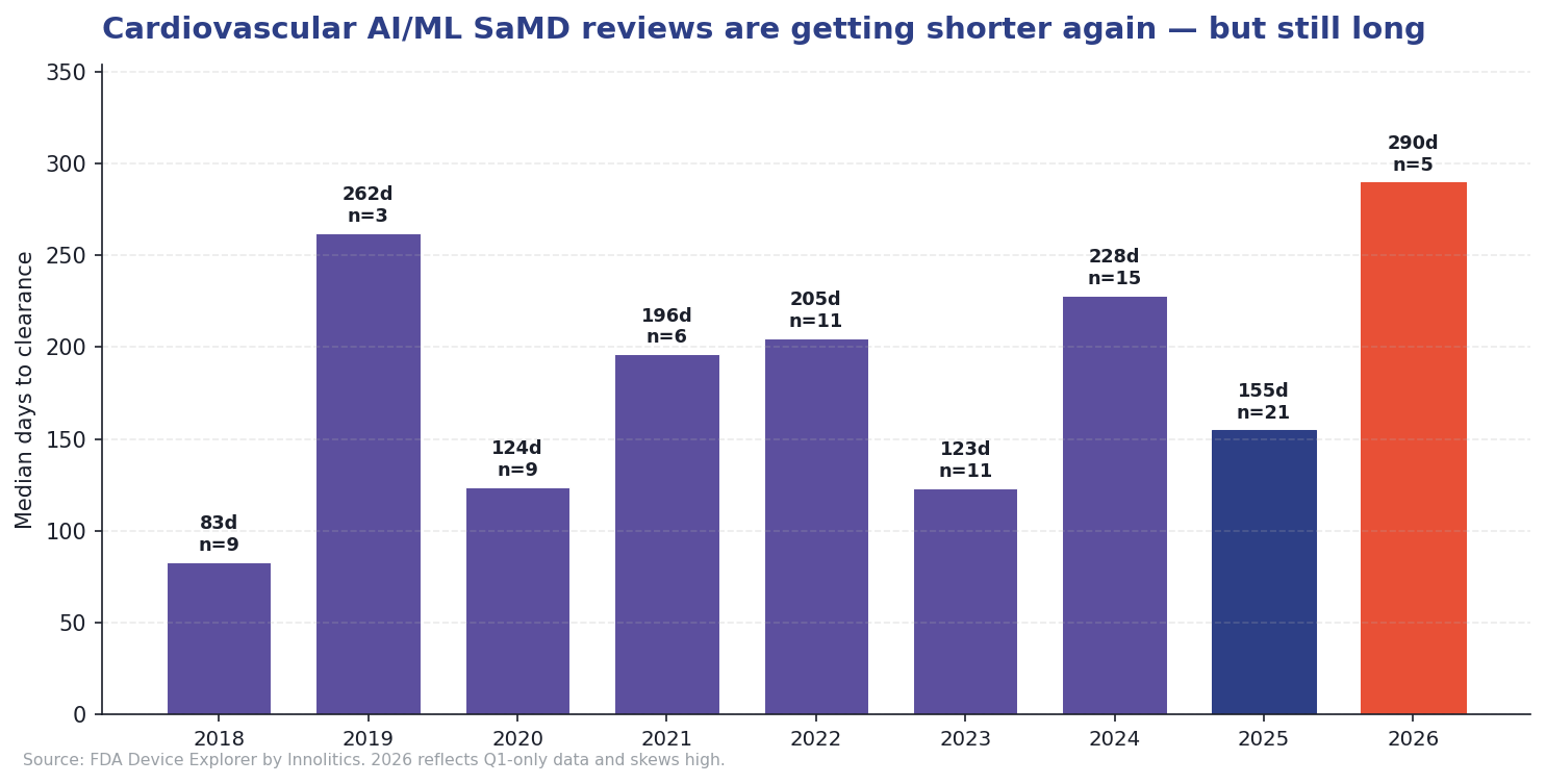 The trend is improving. After peaking at a median of 228 days in 2024, review time dropped to 155 days in 2025, close to radiology AI [1]. The early-2026 spike to 290 days is a small-sample artifact (n=5) weighted by complex submissions clearing after long reviews and should not be read as a regression. Volume-weighted, the longer-run trajectory is downward. As predicates for the new codes accumulate, cardiology should converge on the radiology median within two years.