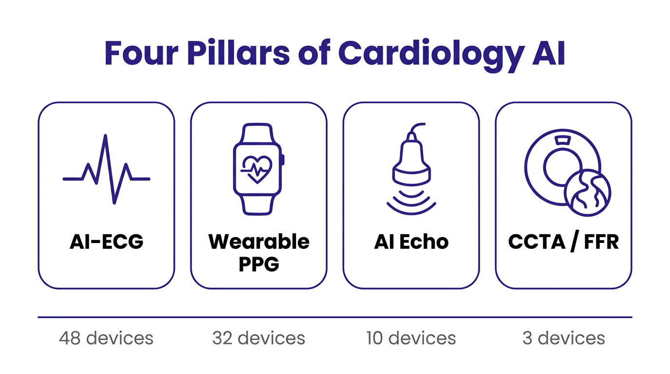 The four primary pillars are AI on the electrocardiogram (AI-ECG), AI on wearable PPG signals, AI on echocardiographic images, and AI on coronary CT angiography (CCTA) including FFR-CT. Each pillar has a different patient population, a different regulatory pattern, and a different commercial logic.