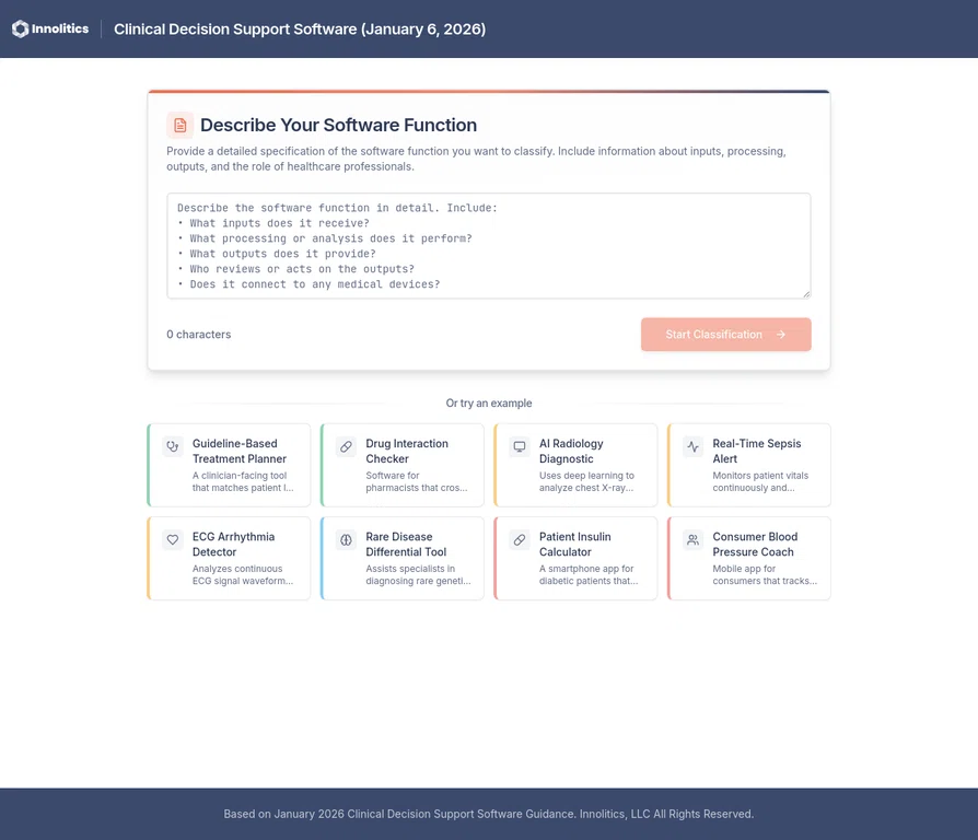 We built an interactive CDS assessment tool to help you determine whether your software falls under FDA's Non-Device CDS enforcement discretion or requires regulatory submission.