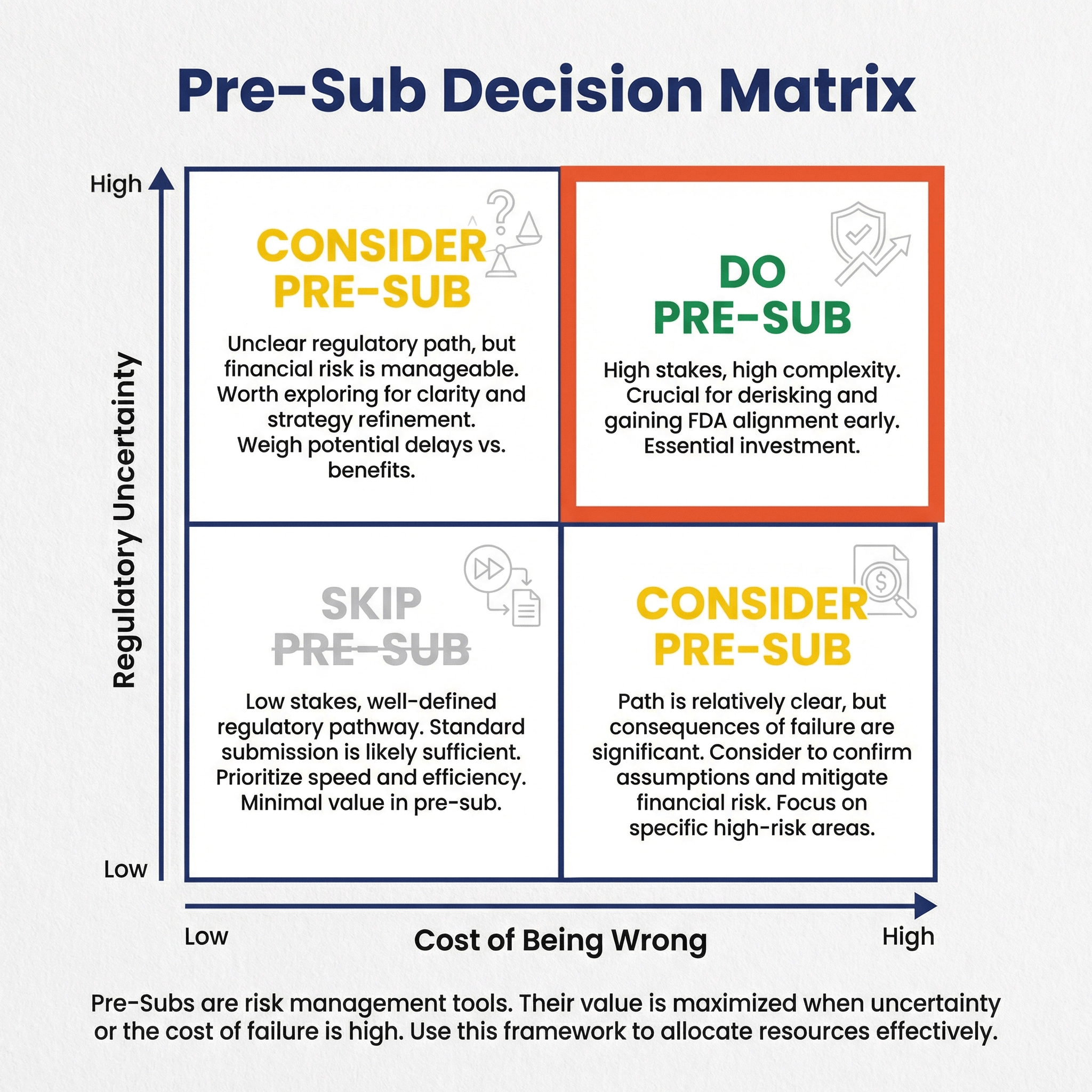 - Otherwise, do a Pre-Sub as soon as high-risk regulatory questions are identified