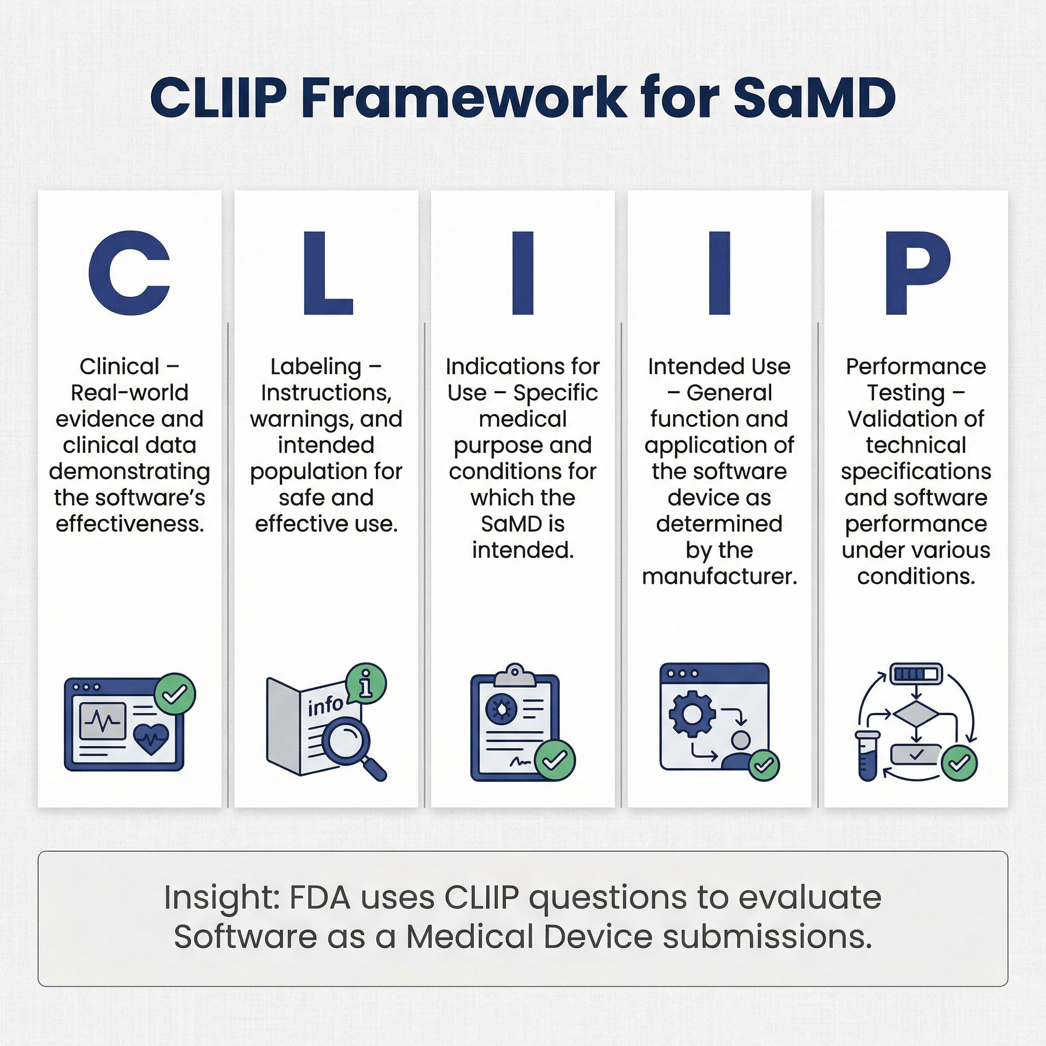 In one of our recent presubmissions, FDA shared a "CLIIP Questions for Software Review" document with us. CLIIP stands for “clinical, labeling, indications for use, intended use, and performance testing”. This document is a way for the FDA to share informal recommendations to provide some guidance for all the information for a SaMD that may be required for a review of the device.