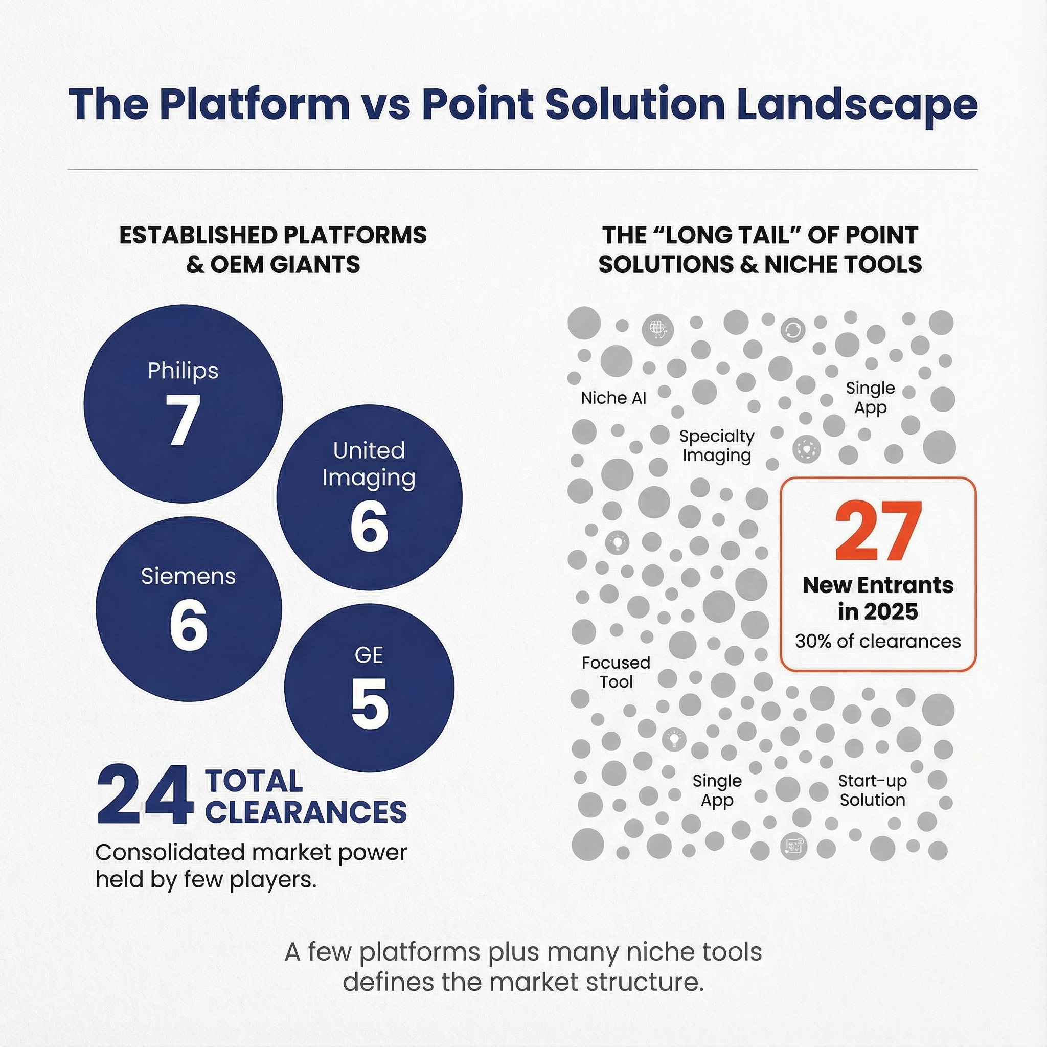 - Incumbent imaging OEMs are shipping AI/ML as a feature, not a standalone product. Siemens, Philips, GE, Canon, and Fujifilm appear repeatedly. That generally compresses standalone “point solution” margins unless the point solution has a unique claim, unique data moat, or a payment tailwind.