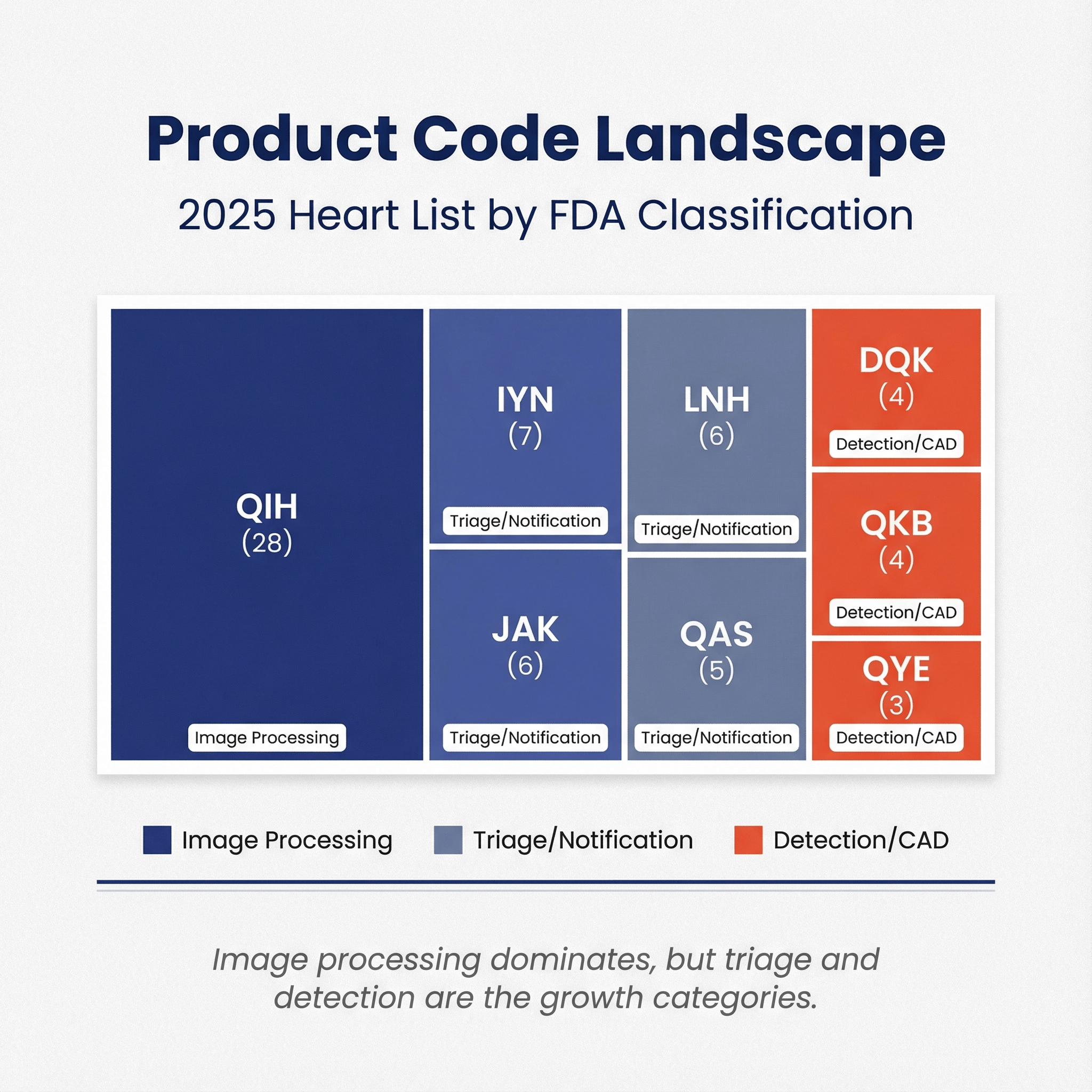 Cardiology AI/ML clearance volume increased from 62 (2024) to 92 (2025). A simple growth extrapolation suggests 2026 could land around 100 to 125 decisions in cardiology AI/ML.