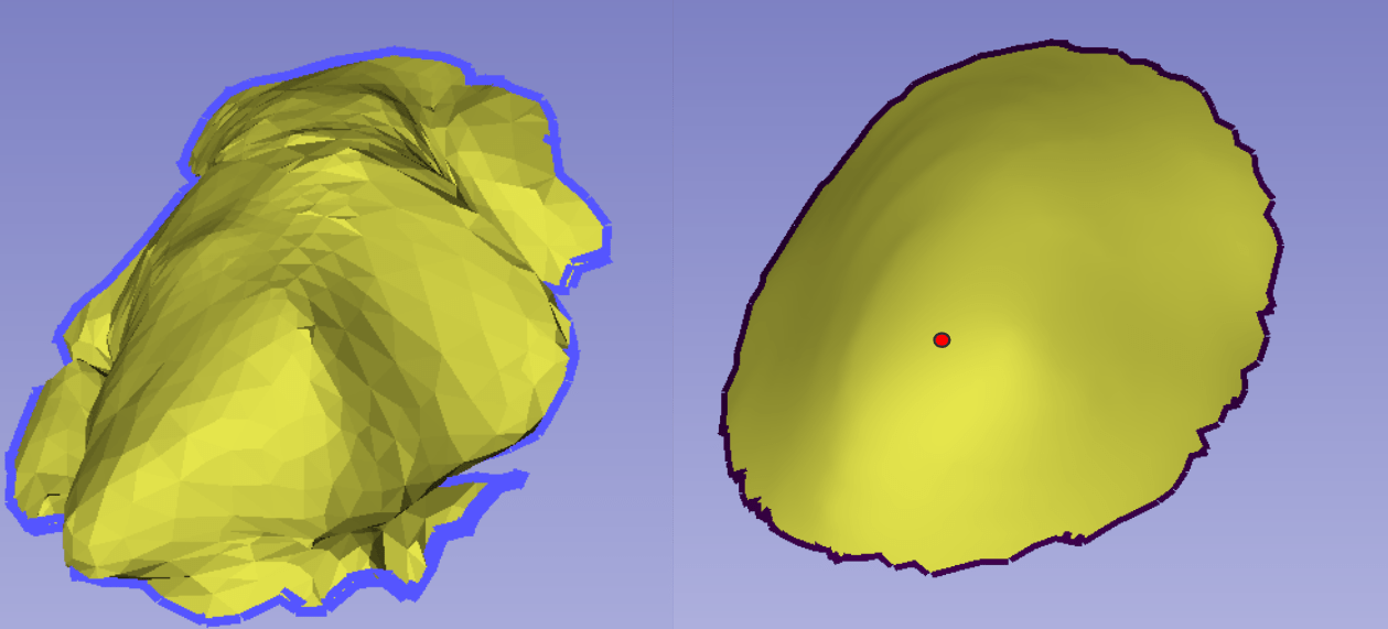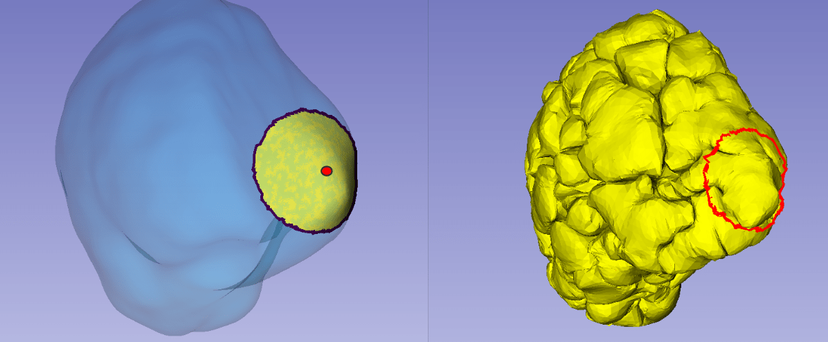 Fig.3: (Left) In red, vertex chosen to compute the local gyrification